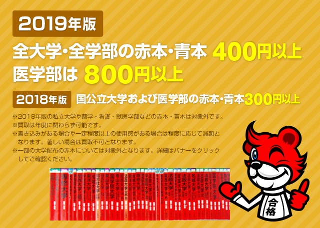 弊社では最新版の赤本・青本は買取価格400円以上保証、医学部は800円以上保証で買取しています。