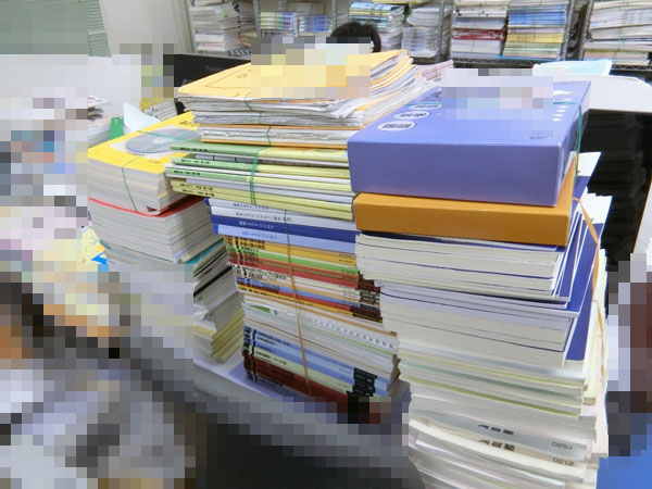 出品準備中のテキストや赤本が机に山盛り状態となっております。