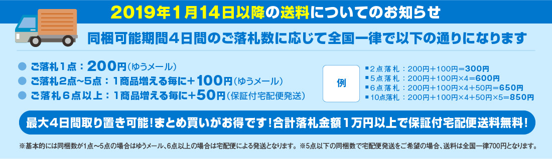 1/16にもご案内させていただきましたが、約一年間開催しておりました【送料200円買い放題キャンペーン】は2019/1/13ご落札分をもって終了致しました。