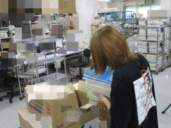 全て取り出せたら検品作業に入ります。ベテランスタッフは検品しながら査定も同時にこなしていきますが、Kさんはまだ修行の身!基礎が大事な時期なので1冊1冊見落としがないようチェックしていきます。コツを掴めばスピードも上がっていきますよ!頑張って!!