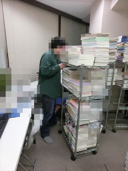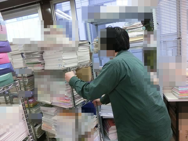 検品が終了したテキストをラックに入れて運んでおります。